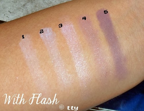 The palette consist of 5 different colors; three(Nos. 2,3&4) with shimmers and two(Nos. 1&2) are mattes. The combination of colors is really nice. I swatched them naked without any use of eyeshadow primer. Since three of the eyeshadows are pastels, I didn't expect much pigmentation the difference of the colors are barely visible. You can use them as your base eyeshadow, on browbone or anhything for highlighting. While the other dark shades pays off a really good color, especially the no.5, it's a strong violet that you can use to contour your eyes and perfect to achieve the smokey eye look combined with the no.4.